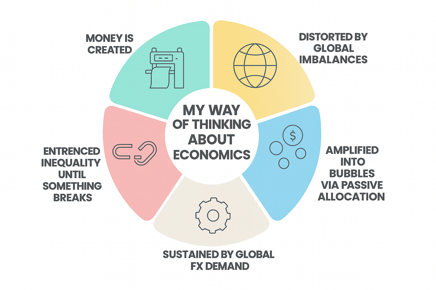 That is the real engine of the modern economy: a feedback loop of money creation, distorted flows, asset inflation, dollar demand, and inequality. We do not live in a system designed to reach equilibrium. We live in a system designed to keep the loop spinning.